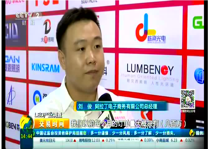 今年第21屆廣州國際照明展覽會期間,針對芯片和封裝需求回升,業態扭轉的局面,央視CCTV-2財經頻道節目《交易時間——LED產業調查》進行了相關報道,并到展會現場拍攝視頻資料,阿拉丁電子商務有限公司總經理劉俊作為業內人士接受采訪。雖然不是直接獲得國家領導人的青睞,但能夠獲得出現在國家官方宣傳平臺的出境機會,阿拉丁全體小伙伴表示深感榮幸~~