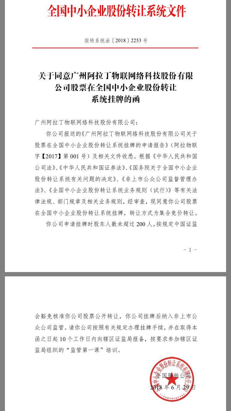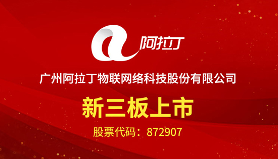 6月29日,根據全國中小企業股份轉讓系統有限責任公司發布的函件顯示,廣州阿拉丁物聯網絡科技股份有限公司在全國中小企業股份轉讓系統正式掛牌,成功登陸“新三板”,公司股票簡稱為【阿拉物聯】,股票代碼為【872907】。