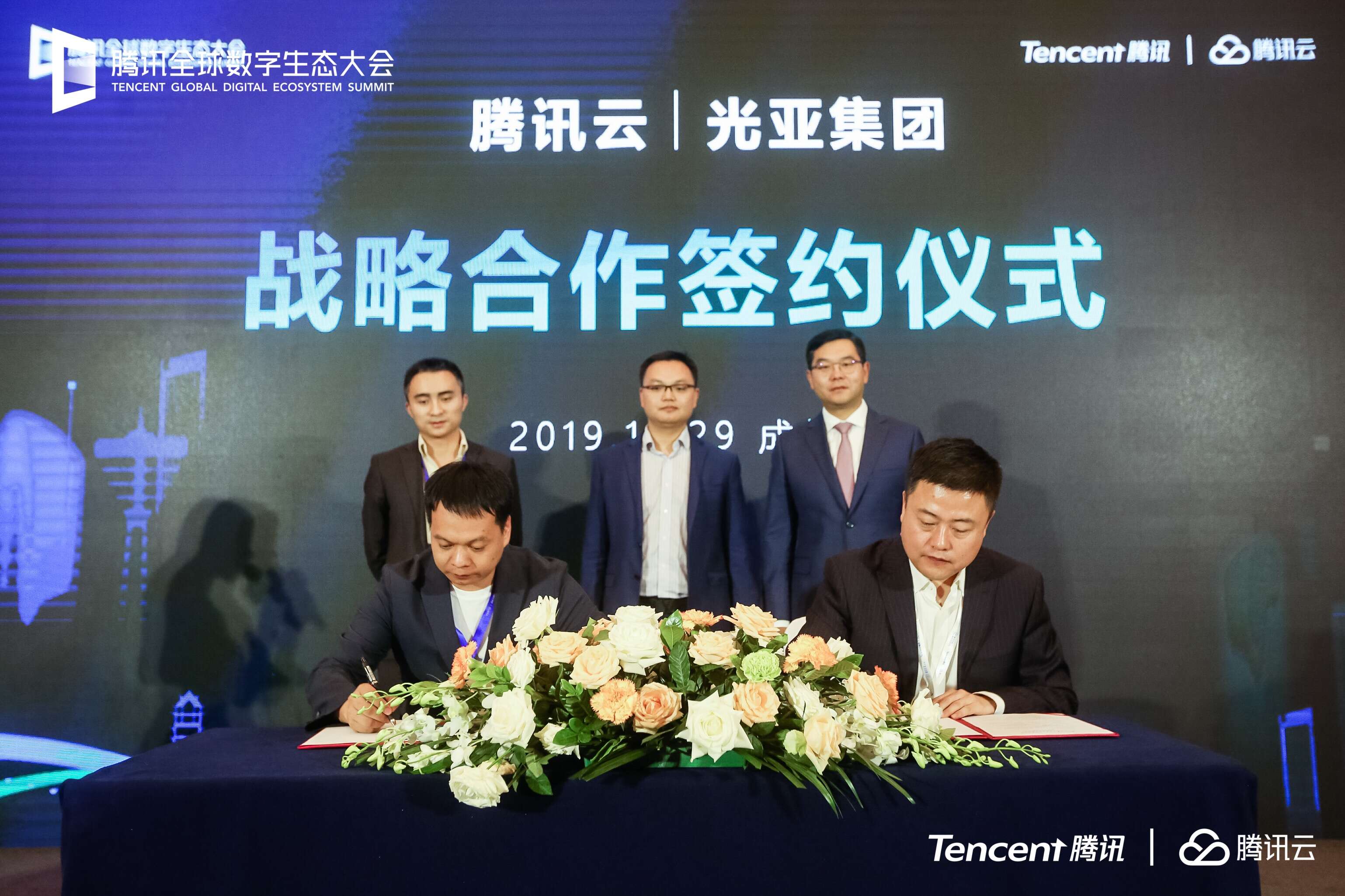 光亞集團(tuán)董事兼阿拉物聯(lián)總經(jīng)理程云(左二)與騰訊云副總裁張浩(右一)見(jiàn)證簽約