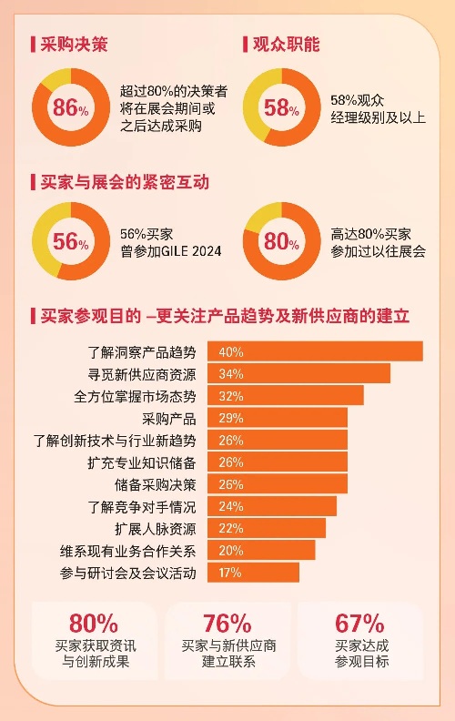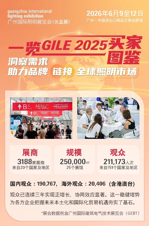 第30屆廣州國際照明展覽會(GILE)于2025年6月12日在廣州中國進出口商品交易會展館圓滿落幕?;?025年調研數據,本文從買家畫像、海外買家分布及貿易配對、買家觀眾產品品類及采購決策等多個維度,全方位描繪出展會高質量買家的整體圖景,以期為2026年展會助力照明廠商挖掘新商機、開辟新路徑提供有力支撐。